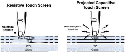 The difference in touch response between a traditional resistive touch panel and a projected capacitive touch panel is based on the underlying technology used to determine the location of the touch. Unlike a resistive touch panel, which works by shorting one conductive layer to another, a projected capacitive touch panel uses capacitive coupling between the user’s finger and the touch panel to determine the location of the touch. If there is no capacitive coupling, the touch panel can’t recognize if a finger is present.