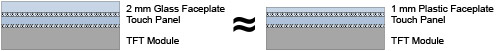 Another way to effectively increase the field strength is to decrease the amount of materials between the user’s finger and the touch panel sensor. For example, if you want your application to work with a heavy winter glove, then you might have to reduce your original 4 mm faceplate down to just 1 mm. You might also want to consider using glass instead of plastic since glass has a much higher dielectric and therefore does a much better job of coupling the user’s finger to the electrodes. A general rule of thumb is that in order for a plastic faceplate to have the same touch performance as a glass faceplate, the plastic faceplate needs to be half as thick (Figure 3).