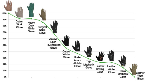 One of the most important things to remember when designing a projected capacitive touch panel for glove use is that not all gloves are created equal. The user’s experience with a product depends greatly on what kind of glove they are wearing. By understanding the various factors involved, you can provide some guidance to your users on what kind of glove works best. The following graph shows some relative measurements for a variety of gloves. The measurements are normalized to a bare finger which is defined as a baseline of 100%. Each glove is then listed based on how much attenuation it had compared to the bare finger. Keep in mind that this data was collected on one type of touch panel with one type of controller for one user. The results are intended only to show a rough approximation of the relative performance of different kinds of gloves. In other words, “your mileage will vary.”